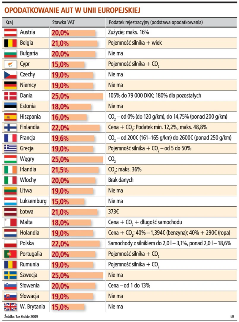 W ramach państw UE nie ma jednolitych zasad dotyczących opodatkowania posiadaczy samochodów. Według informacji Pawła Jabłonowskiego, szefa Departamentu Podatkowego Chałas i Wspólnicy Kancelaria Prawna, w niektórych krajach rejestracja nowych pojazdów jest opodatkowana, w innych tego podatku nie ma. Stąd prace nad wprowadzeniem nowej dyrektywy, która ujednoliciłaby tę kwestię i wprowadziła zasadę systematycznego, corocznego opodatkowywania posiadaczy samochodów.
