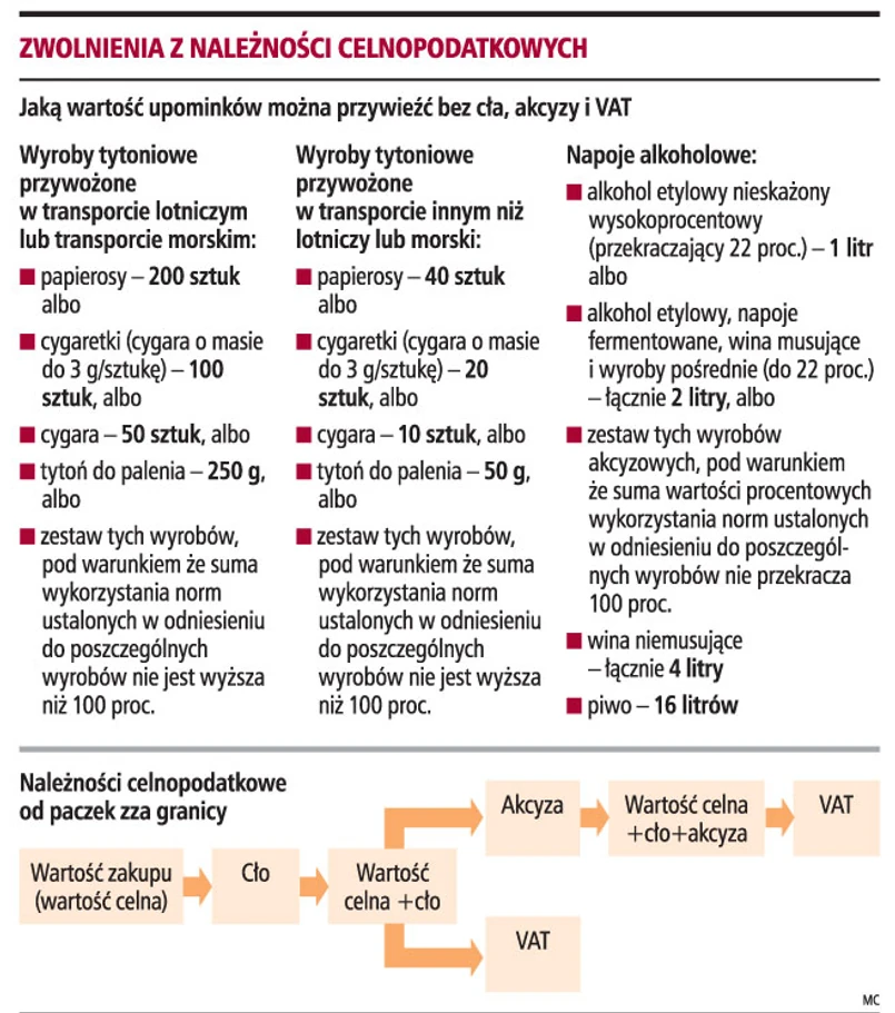 Jednak zwolnienie dla należności celnych dotyczy nie tylko przesyłek zamawianych przez internet, lecz także drobnych upominków przywożonych osobiście. Od grudnia zostały zwiększone limity przywozowe dla podróżnych: średnio ponaddwukrotnie ze 175 euro do 430 euro w ruchu lotniczym i morskim oraz do 300 euro w ruchu lądowym. Oznacza to, że bez cła można przywieźć prezenty i upominki o większej wartości. Oprócz upominków zwolnionych z cła podniesiono limit przywozu w bagażu podręcznym alkoholi. Zwiększono limity przywozowe z 2 l do 4 l wina i 16 l piwa. Ograniczono natomiast przywóz liczby papierosów, które można przywieźć na teren Wspólnoty bez cła, do 40 sztuk (w transporcie innym niż lotniczy i morski). Takie same zwolnienia obowiązują przy VAT oraz akcyzie.