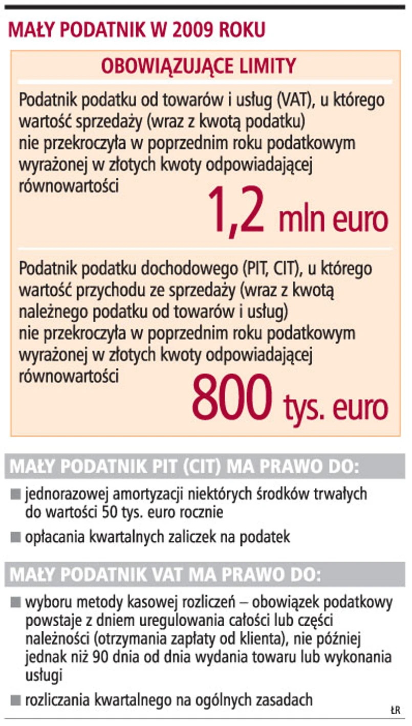 Dorota Borkowska, doradca w departamencie doradztwa podatkowego Grant Thornton Frąckowiak wskazuje, że zwiększenie limitu w VAT powoduje, że mali podatnicy rozliczający się metodą kasową i składający deklaracje kwartalne, u których wartość sprzedaży (razem z VAT) nie przekroczy do końca tego roku 1,2 mln euro, tj. 4053 tys. zł, nadal będą mogli rozliczać się w ten sam sposób. Według ustawy o PIT dla utrzymania statusu małego podatnika w 2009 roku nie można w tym roku przekroczyć wartości przychodu ze sprzedaży (razem z VAT) w wysokości 800 tys. euro, tj. 2702 tys. zł (w 2008 roku jest to kwota 3014 tys. zł).