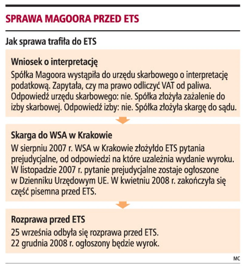 Przejdźmy teraz do sprawy, którą zajmuje się ETS. Jak podaje nam Przemysław Skorupa, doradca podatkowy w Baker & McKenzie Doradztwo Podatkowe, w sierpniu 2005 r. krakowska spółka Magoora wystąpiła do naczelnika urzędu skarbowego z wnioskiem o interpretację przepisów dotyczących odliczania VAT przy nabyciu paliwa do samochodu używanego przez spółkę na podstawie umowy leasingu. Ta umowa została zawarta przez spółkę w marcu 2005 r. i dotyczyła samochodu, który spełniał w owym czasie kryteria pozwalające na odliczenie całości podatku naliczonego - wynikające z tzw. wzoru Lisaka. Umowa ta została zarejestrowana przez urząd skarbowy w czerwcu 2005 r., co pozwoliło spółce na kontynuowanie odliczania całości podatku z tytułu rat leasingowych pomimo zmiany przepisów dotyczących odliczeń w przypadku leasingu samochodów od 22 sierpnia 2005 r. Jednak, od 22 sierpnia 2005 r. użytkowany przez spółkę samochód przestał spełniać kryteria umożliwiające odliczenie podatku naliczonego z tytułu nabycia paliwa.