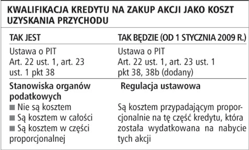 Nowelizacja ustawy o PIT określa, że kosztem uzyskania przychodu przy sprzedaży akcji będą tylko te wydatki na obsługę kredytu zaciągniętego na zakup akcji, które rzeczywiście będą związane z kupionymi akcjami, tj. będą przypadać proporcjonalnie na tę część kredytu, która została wydatkowana na nabycie tych akcji.