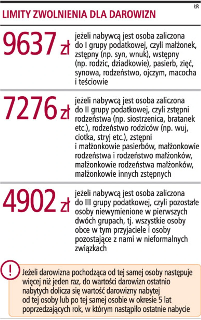 Ale uwaga. Limit obejmuje wszystkie darowizny. Nie tylko świąteczne prezenty. Również prezenty i darowizny przekazywane z innych okazji. Jeśli zatem teść najpierw dołożył się nam do samochodu, przekazując zięciowi na ten cel 9,5 tys. zł, a następnie sprezentuje mu na gwiazdkę zegarek za 250 zł, to limit zwolnienia zostanie przekroczony i z gwiazdkowego podarunku zięć powinien się rozliczyć (podatek należy się od nadwyżki ponad limit, czyli od 113 zł). Tak przynajmniej wynika z obowiązujących przepisów.