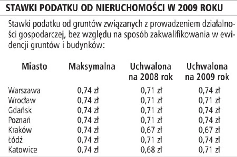 Od 1 stycznia 2009 r. stawki podatku od nieruchomości nieznacznie wzrosną. W największych miastach Polski będą one jednak na podobnym poziomie jak w 2008 roku.