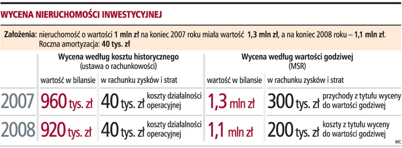 Stosowanie różnych metod wyceny nieruchomości inwestycyjnych oznacza, że mogą one w różny sposób być wykazywane w sprawozdaniu. Prześledźmy więc przykład zastosowania metody wartości godziwej według MSR oraz kosztu historycznego i wartości przeszacowanej według ustawy o rachunkowości. Załóżmy też, że nieruchomość o wartości 1 mln zł na koniec 2007 roku miała wartość 1,3 mln zł, natomiast na koniec 2008 roku - 1,1 mln zł.