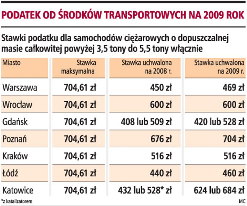 Z analizy stawek uchwalonych przez rady kilku największych miast wynika, że jedne z niższych podatków zapłacą właściciele środków transportowych w Łodzi (mimo podwyżek stawek), Gdańsku i Warszawie. Najwyżej opodatkowani są właściciele środków transportowych w Poznaniu.