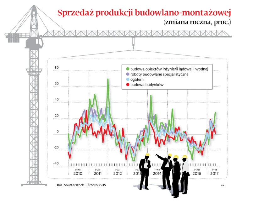 Czerwiec i lipiec to tradycyjnie najlepsze okresy dla budowlanki. Mimo to nastroje w firmach z tej branży są gorsze niż w innych działach gospodarki. W lipcu obliczany przez Główny Urząd Statystyczny indeks koniunktury w budownictwie wyniósł 6,3 pkt. Poprawę sygnalizowało 19,3 proc. przedsiębiorstw, a pogorszenie 13 proc. W przetwórstwie przemysłowym wskaźnik koniunktury wyniósł 7,4 pkt, w handlu hurtowym 9 pkt, w handlu detalicznym 8,3 pkt, w transporcie i gospodarce magazynowej 8,6. Najlepsze nastroje dotyczą tradycyjnie działalności finansowej i ubezpieczeniowej. Tu wskaźnik wyniósł 27,8 pkt.