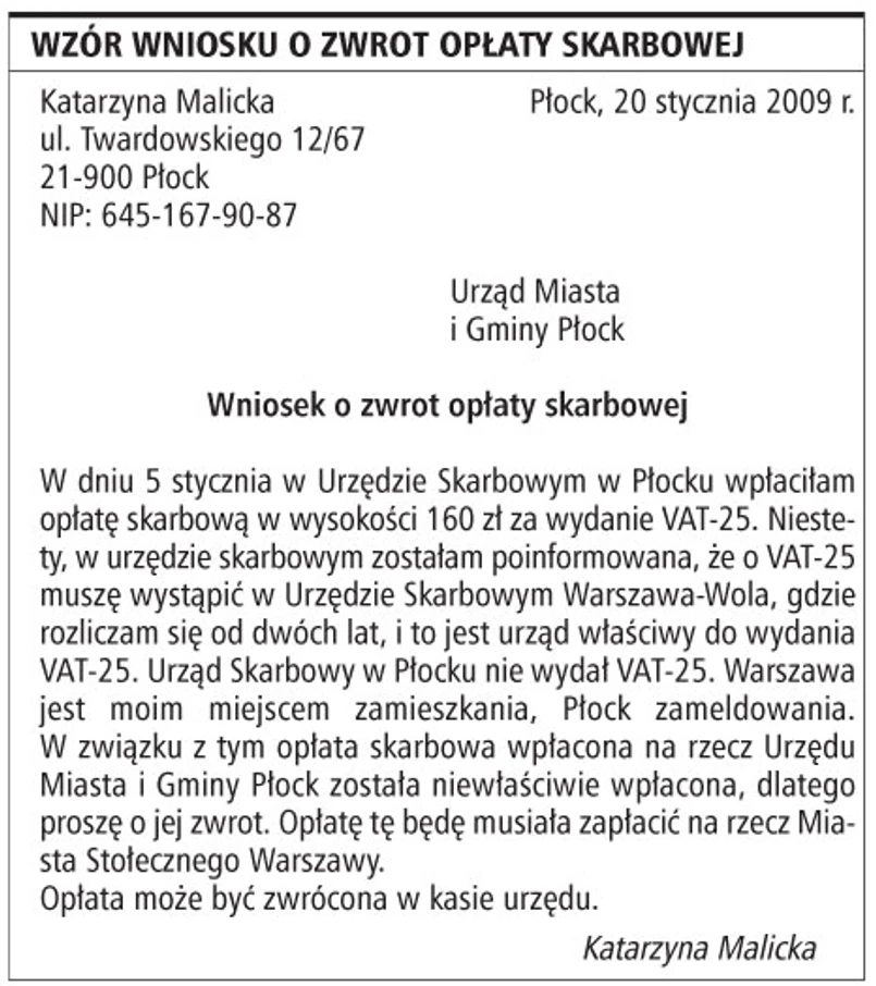 - Wpłaciłam do urzędu skarbowego opłatę skarbową w wysokości 200 zł, bo potrzebowałam pewnych zaświadczeń. Okazało się jednak, że opłatę muszę wpłacić w miejscu zamieszkania, a nie zameldowania. A są one inne. Poszłam do kasy fiskusa. Urzędniczka odesłała mnie jednak do urzędu miasta, na rzecz którego
