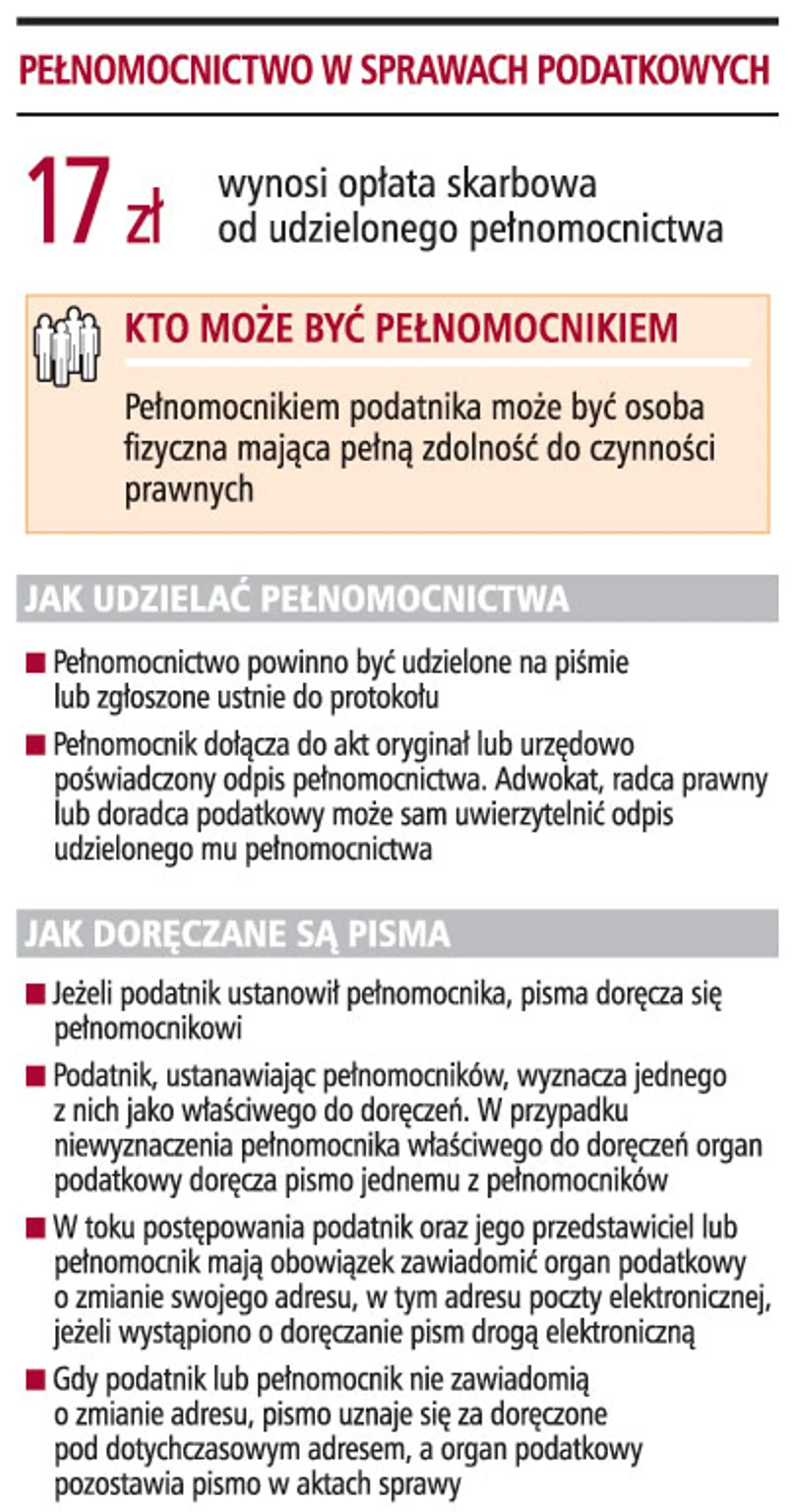 W przypadku niedoręczenia decyzji pełnomocnikowi podatnika pod wskazanym adresem poczta przechowuje pismo przez 14 dni w swojej placówce pocztowej. Na ten aspekt zwraca uwagę Barbara Pyzel, doradca podatkowy, która stwierdza, że jeśli nastąpi zmiana pełnomocnika, to nowy pełnomocnik lub strona mają obowiązek zawiadomić organ podatkowy o adresie nowego pełnomocnika. Wtedy organ podatkowy wysyła decyzję pod nowy adres. W razie niemożności doręczenia decyzji pełnomocnikowi podatnika pod wskazanym adresem poczta przechowuje pismo przez 14 dni w swojej placówce pocztowej. I tak dalej.