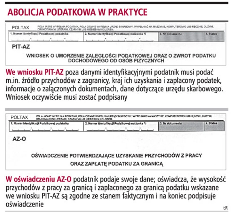 Osoba, która ma prawo skorzystać z abolicji podatkowej, musi złożyć w urzędzie skarbowym wniosek - PIT-AZ. Do wniosku trzeba też załączyć oświadczenie potwierdzające uzyskanie przychodów z pracy poza Polską oraz zapłatę podatku za granicą (jeśli taki podatek trzeba było zapłacić). Zgodnie z przepisami ustawy abolicyjnej podatnik jest zobowiązany dołączyć do wniosku o przyznanie abolicji: