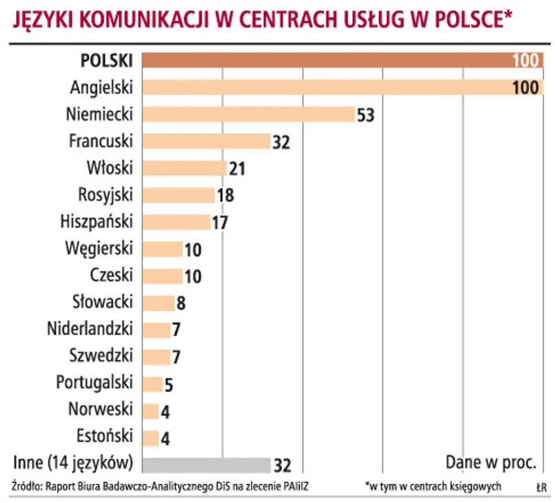 Najwięcej księgowych zatrudniają centra międzynarodowych koncernów takich, jak Bertelsmann/Arvato (Poznań), HP (Warszawa, Wrocław), IBM BPO (Kraków) oraz Infosys (Łódź). Prowadzą one obsługę w wielu językach. Z 300 największych centrów, które badał DiS, sześć obsługuje klientów aż w 18 językach. Księgowość i raportowanie w centrach prowadzi się bowiem w języku klienta.