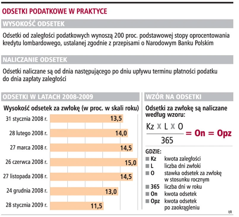 Podatnik, który posiada zaległość podatkową, musi oprócz długu wpłacić fiskusowi należne odsetki. Ich wysokość zależy od wysokości stopy kredytu lombardowego, ogłaszanej przez NBP. W okresie od stycznia 2008 r. do stycznia 2009 r. Rada Polityki Pieniężnej (RPP) siedem razy zmieniała stopy procentowe, w tym również stopę kredytu lombardowego. W konsekwencji każdy podatnik z długiem podatkowym musi ostrożnie wyliczać wysokość odsetek. Za okres istnienia zaległości oblicza się odsetki w wysokości obowiązującej w danym okresie. Jeśli przykładowo podatnik posiadał zaległość w okresie od 1 lutego 2008 r. do 30 czerwca 2008 r. odsetki będzie trzeba obliczyć według następujących stawek: od 1 do 27 lutego odsetki wynosiły 13,5 proc., od 28 lutego do 26 marca - 14 proc., od 27 marca do 25 czerwca - 14,5 proc., od 26 do 30 czerwca - 15 proc.