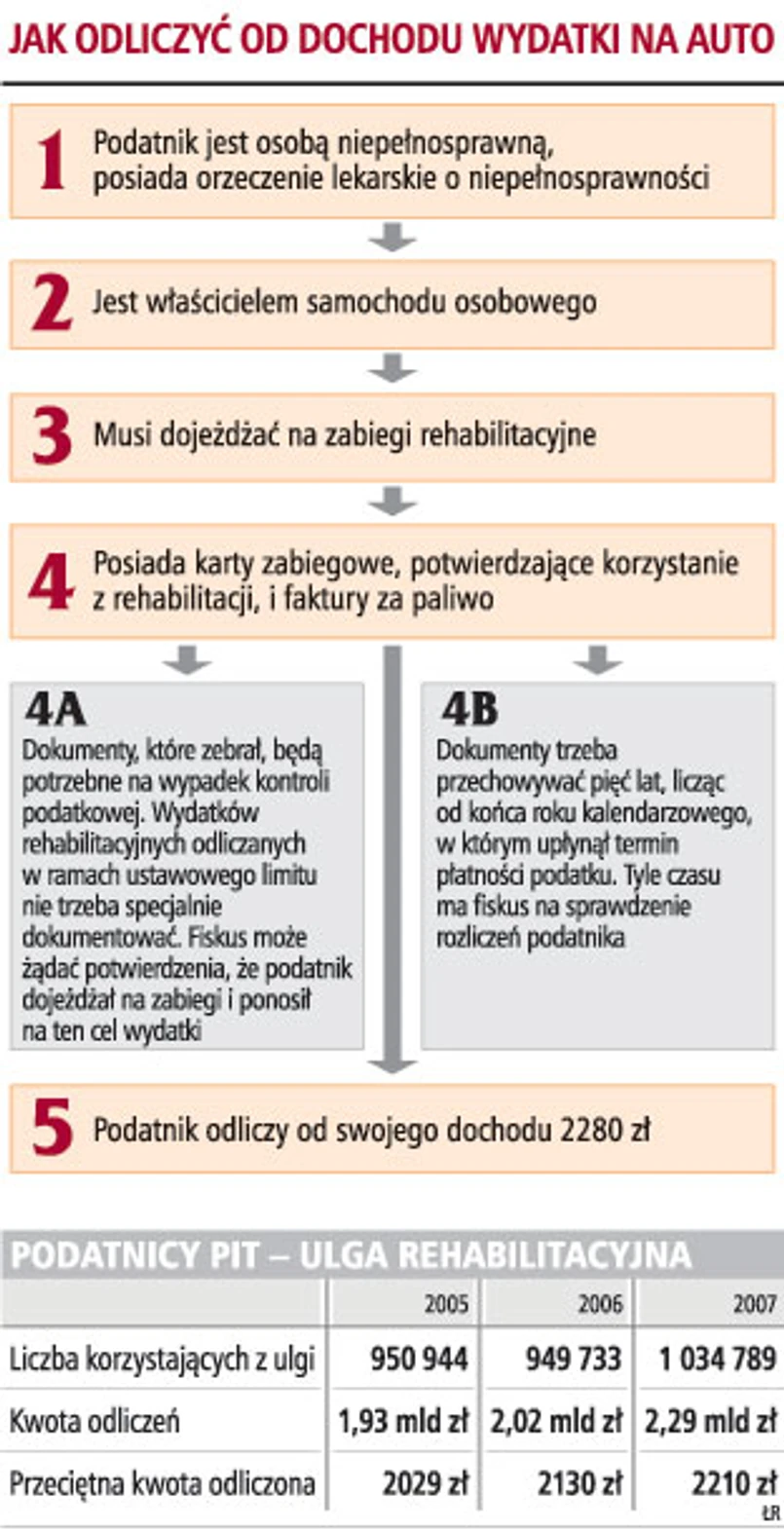 W ustawie o PIT w związku z używaniem samochodu przez osobę niepełnosprawną mamy przepis informujący, że wydatkiem na cele rehabilitacyjne jest używanie samochodu osobowego, stanowiącego własność (współwłasność) osoby niepełnosprawnej zaliczonej do I lub II grupy inwalidztwa lub podatnika mającego na utrzymaniu osobę niepełnosprawną zaliczoną do I lub II grupy inwalidztwa albo dzieci niepełnosprawne, które nie ukończyły 16 roku życia, dla potrzeb związanych z koniecznym przewozem na niezbędne zabiegi leczniczo-rehabilitacyjne - w wysokości nieprzekraczającej w roku podatkowym kwoty 2280 zł.