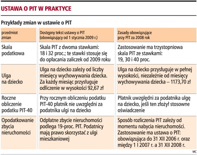 Od 1 stycznia 2009 r. obowiązuje znowelizowana ustawa o podatku dochodowym od osób fizycznych. Podatnik, który przy rozliczeniu PIT za 2008 rok będzie chciał skorzystać z najnowszego tekstu tej ustawy, może popełnić wiele błędów. Wszystko dlatego, że dostępna m.in. w księgarniach wersja ustawy nie zawiera przepisów przejściowych oraz tych, które mówią o czasowych ramach stosowania danych regulacji. Tylko w ostatniej nowelizacji jest siedem przepisów przejściowych, które dotyczą m.in. ulgi odsetkowej, zasad rozliczania PIT przy zbyciu nieruchomości czy ulgi na dzieci.