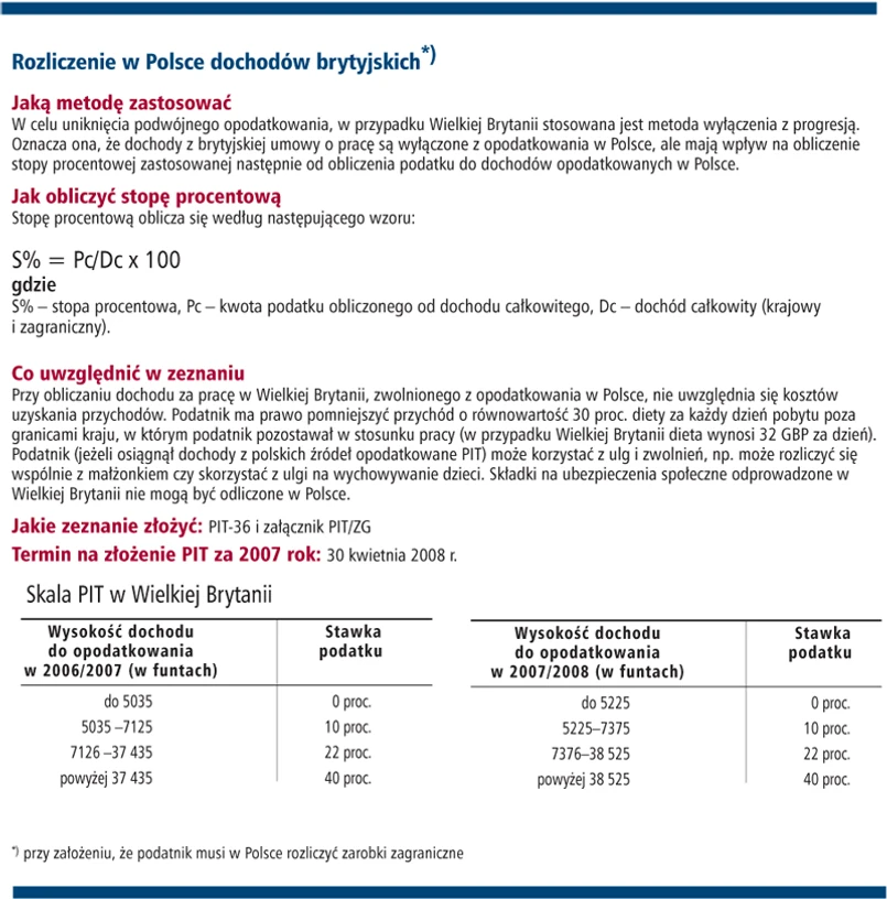 Dodaje, że rozliczając się za rok 2007, osoba ta będzie musiała wykazać w zeznaniu rocznym dochody za pracę w Wielkiej Brytanii, jeśli poza dochodami zagranicznymi uzyskała w Polsce inne dochody. Trzeba jednak podkreślić, że dochody brytyjskie uzyskane po 1 stycznia 2007 r. są zwolnione z opodatkowania w Polsce (zgodnie z metodą wyłączenia z progresją). Należy je wziąć jedynie pod uwagę dla celów obliczenia efektywnej stawki podatkowej, która będzie miała zastosowanie do innych dochodów podlegających opodatkowaniu w Polsce (jeśli takie są).