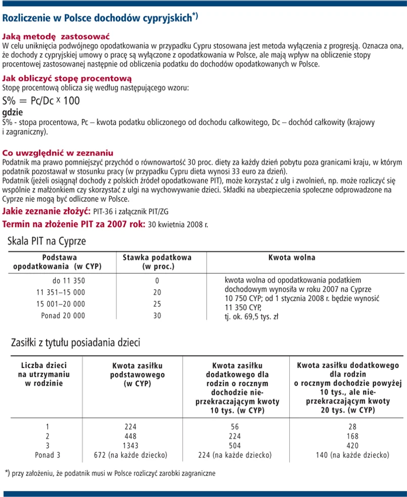 Zgodnie z umową o unikaniu podwójnego opodatkowania zawartej pomiędzy Polską a Cyprem, jeżeli wynagrodzenie polskiego rezydenta podatkowego wykonującego pracę na terytorium Cypru będzie opodatkowane na wyspie, Polska zwolni taki dochód z opodatkowania (jest to metoda wyłączenia z progresją).