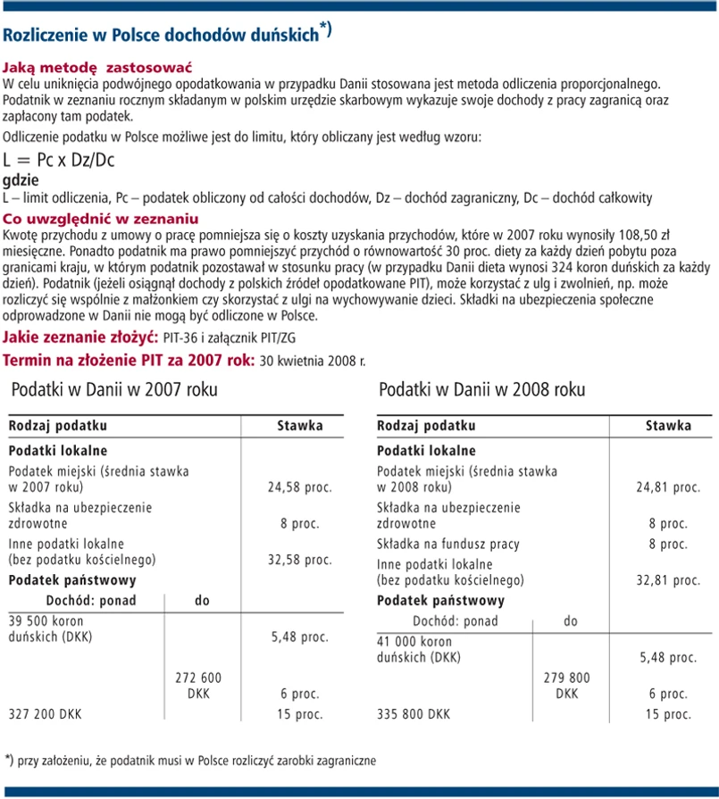 - Zarówno duńscy rezydenci, jak i nierezydenci podatkowi podlegają obowiązkowi podatkowemu od wszystkich dochodów mających źródło w Danii, oczywiście przy uwzględnieniu umów o unikaniu podwójnego opodatkowania, jakie zawarła Dania z innymi państwami. Polsko-duńska umowa stanowi, że przy unikaniu podwójnego opodatkowania dochodu uzyskanego w Danii należy uwzględnić metodę proporcjonalnego odliczenia. Oznacza to, że Polak (będący polskim rezydentem podatkowym) osiągający dochody w Danii powinien je uwzględnić przy obliczaniu efektywnej stawki podatkowej stosowanej do dochodów osiągniętych ze źródeł polskich. Warto zaznaczyć, że osoba mająca w Polsce status nierezydenta podatkowego i osiągająca dochody tylko w Danii, nie musi składać w Polsce zeznania podatkowego - argumentuje ekspert PricewaterhouseCoopers.