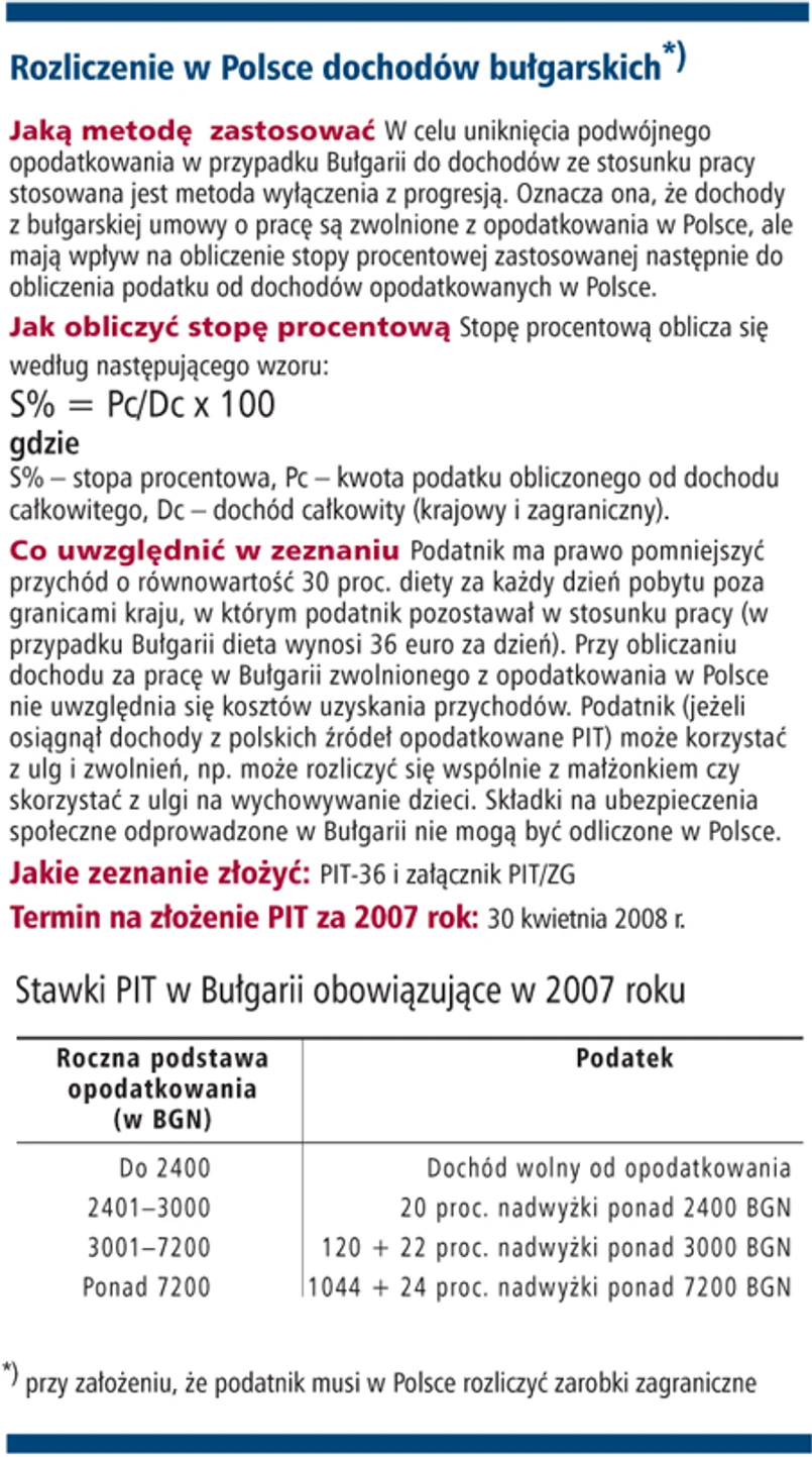 Polak rozliczający swoje dochody z tytułu pracy w Bułgarii w Polsce w celu uniknięcia podwójnego opodatkowania powinien zastosować metodę wyłączenia z progresją. Osoby, które podejmują pracę na terenie Bułgarii i będą miały obowiązki w zakresie podatku dochodowego od osób fizycznych oraz ubezpieczeń społecznych, powinny zarejestrować się w odpowiednim bułgarskim organie skarbowym.