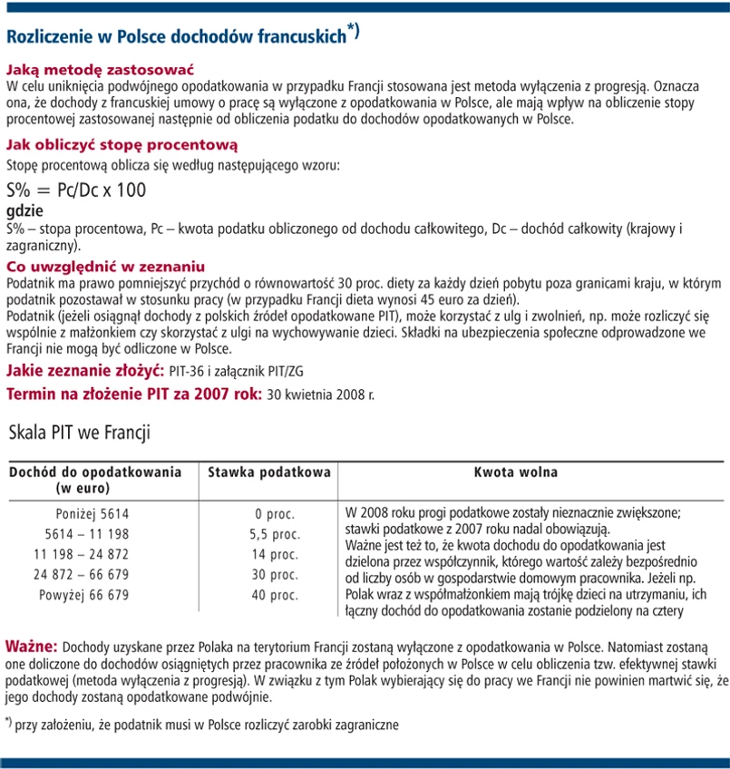 Polak, który podejmie pracę we Francji, będzie podlegać francuskiemu podatkowi dochodowemu od całości swoich dochodów (jeżeli zostanie uznany za francuskiego rezydenta podatkowego) bądź tylko od tej części swoich dochodów, które uzyskał na terenie Francji (np. dochody za pracę wykonywaną na terytorium Francji na rzecz spółki, do której został on oddelegowany, dochody kapitałowe zrealizowane na terenie Francji) w sytuacji gdy nie będzie francuskim rezydentem podatkowym. Z informacji eksperta PricewaterhouseCoopers wynika, że polski podatnik będzie postrzegany jako rezydent podatkowy przez francuskie władze skarbowe, jeżeli zostanie spełniony chociażby jeden z następujących warunków: