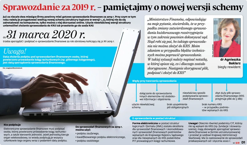 Tworząc roczny raport, trzeba się upewnić, że wpisany został do niego numer KRS, aktualny kod działalności PKD, a plik raportu nie ma więcej niż 5 Mb, w przeciwnym razie będzie problem ze złożeniem dokumentów do rejestru sądowego. Korzystający z aplikacji do tworzenia plików XML muszą też sprawdzić, czy zgadzają się wszystkie sumy poszczególnych pozycji - mówi dr Agnieszka Baklarz biegły rewident, członek zarządu w A. Bombik Kancelaria Biegłego Rewidenta