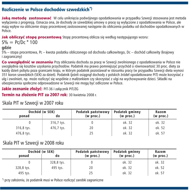 Osoba podejmująca pracę w Szwecji lub oddelegowana tam przez polskiego pracodawcę, co do zasady, będzie podlegała opodatkowaniu w tym kraju. Dochód ze stosunku pracy podlegać będzie gminnemu oraz państwowemu podatkowi dochodowemu od osób fizycznych. Inne podatki, które mogą wchodzić w grę, to podatek od dochodów kapitałowych, podatek majątkowy oraz podatek od nieruchomości.