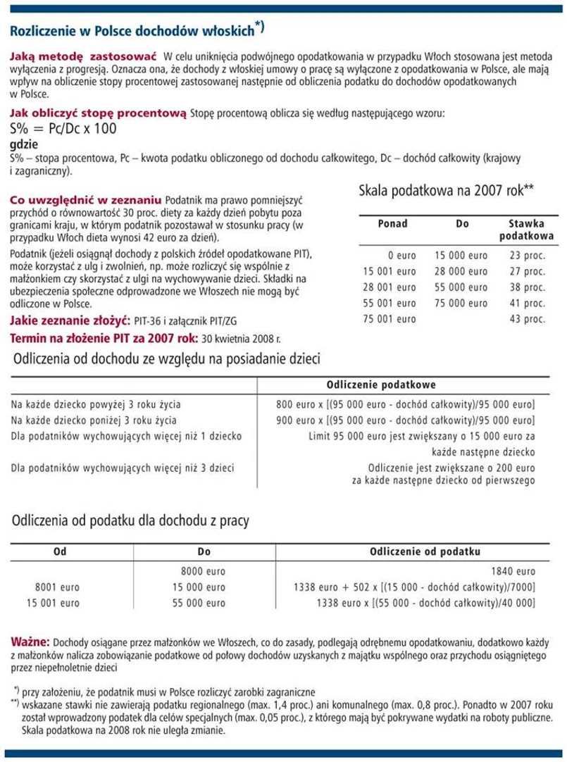 Agnieszka Janeczek, konsultant w dziale doradztwa podatkowego PricewaterhouseCoopers wyjaśnia, że z drugiej strony według zasad, które weszły w życie 1 stycznia 2007 r., za osobę posiadającą w Polsce miejsce zamieszkania dla celów podatkowych uważa się taką, która przebywa w Polsce przez więcej niż 183 dni w roku kalendarzowym albo posiada w Polsce centrum interesów osobistych lub gospodarczych. Wobec tego mogą zaistnieć trzy sytuacje, tzn. Polak wyjeżdżający do pracy na terytorium Republiki Włoskiej może zostać uznany za rezydenta podatkowego we Włoszech lub w Polsce albo w obu krajach jednocześnie. W ostatnim przypadku należy zastosować odpowiednie regulacje, zapisane w polsko-włoskiej umowie o unikaniu podwójnego opodatkowania.