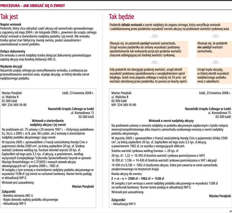 - Wysokość nadpłaty podlegającej zwrotowi zgodnie z projektem byłaby ustalana jako różnica pomiędzy akcyzą zapłaconą przez podatnika a podatkiem zawartym w cenie podobnego samochodu zarejestrowanego na terytorium kraju, z uwzględnieniem wartości rynkowej pojazdu - wyjaśnia ekspert.