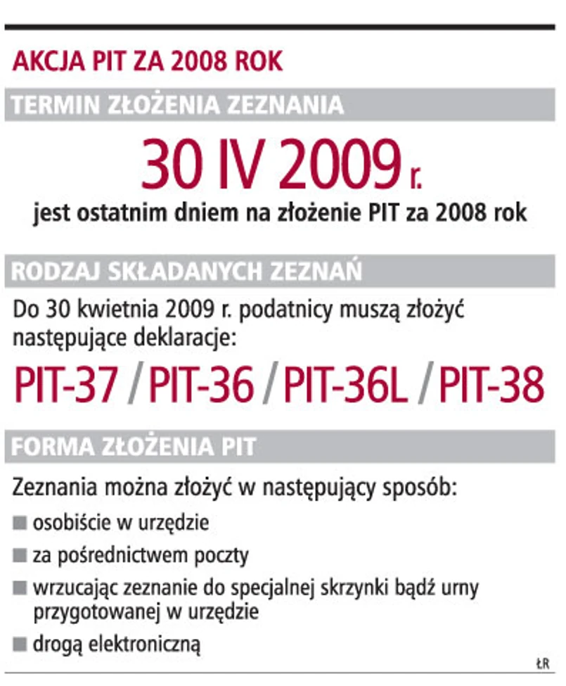 Wszyscy nasi rozmówcy z izb skarbowych byli zgodni: podatnicy powinni jak najszybciej rozliczyć się za 2008 rok, aby pod koniec kwietnia uniknąć kolejek i błędów wynikających z pośpiechu. Jeśli podatnicy mają problemy z wypełnieniem zeznania, w każdym urzędzie mogą otrzymać fachową pomoc. Urzędnicy zachęcają także do korzystania z dyżurów, porad telefonicznych i dni otwartych.