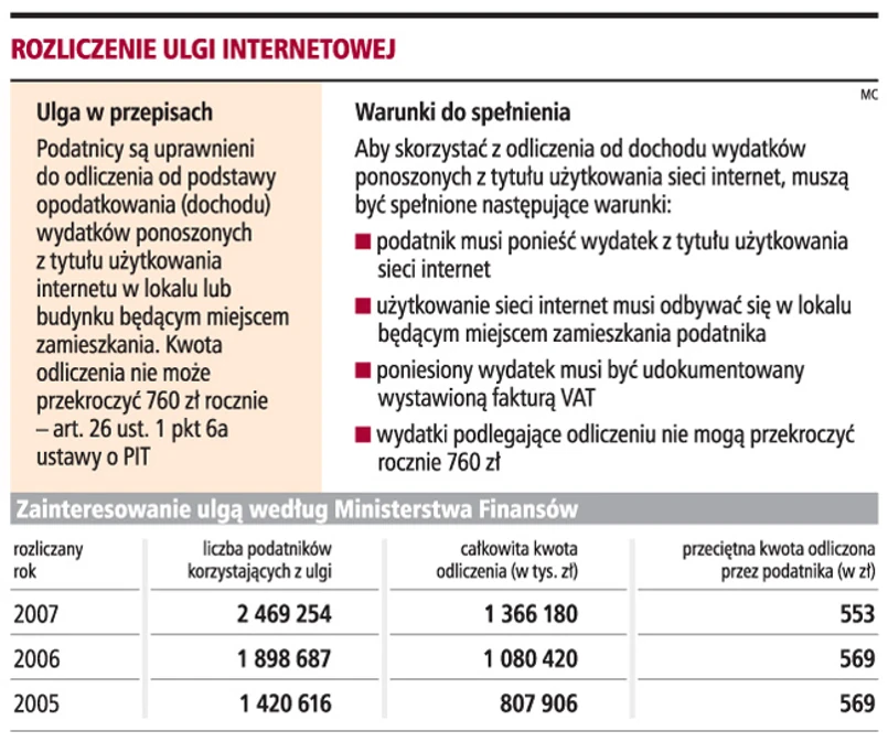 Również Marek Kolibski, doradca podatkowy w Spółce Doradztwa Podatkowego Ożóg i Wspólnicy, podkreśla, że ulga internetowa jest w ostatnich latach bardzo popularna. Aby z niej skorzystać, należy spełnić dwa warunki: ponieść wydatki na użytkowanie sieci internet w lokalu (budynku) będącym miejscem zamieszkania podatnika oraz mieć faktury VAT dokumentujące poniesienie tego wydatku.