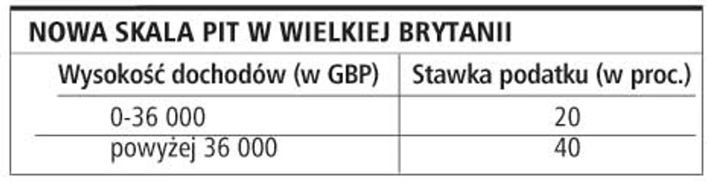 W systemie podatkowym Wielkiej Brytanii została zlikwidowana najniższa, 10-proc., stawka podatkowa (obecnie obowiązują dwie stawki: 20 i 40 proc.). W związku z tym, osoby uzyskujące stosunkowo niskie - jak na brytyjskie warunki - dochody zapłacą od nich wyższy podatek.