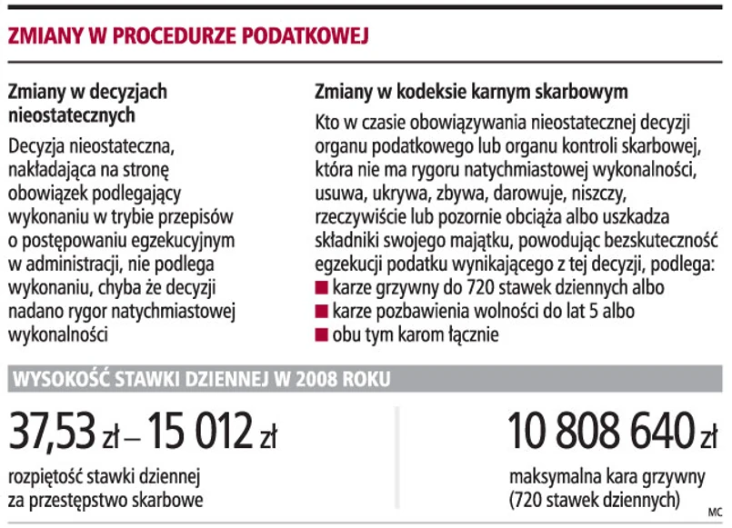 Kto w czasie obowiązywania nieostatecznej decyzji organu podatkowego lub organu kontroli skarbowej, która nie będzie miała rygoru natychmiastowej wykonalności, będzie: usuwał, ukrywał, zbywał, darował, niszczył, rzeczywiście lub pozornie obciążał albo uszkadzał składniki swojego majątku, powodując bezskuteczność egzekucji podatku wynikającego z tej decyzji, zostanie ukarany. Podatnik dokonujący wskazanych czynności będzie podlegał karze grzywny do 720 stawek dziennych albo karze pozbawienia wolności do lat pięciu albo obu tym karom łącznie. Takie zmiany zostaną wprowadzone do