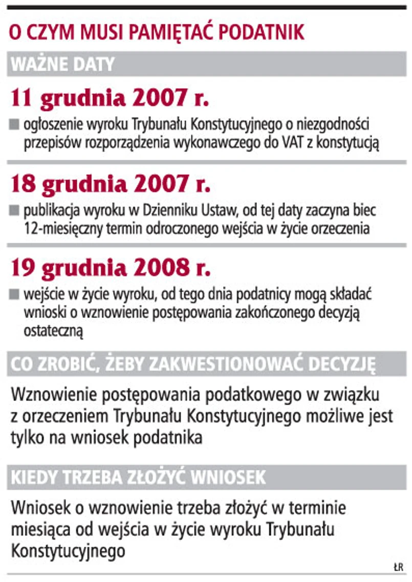 Podatnicy, którym organy zakwestionują odliczenie podatku, mogą odzyskać swoje pieniądze. Po 18 grudnia 2008 r. będą mogli występować z wnioskami o wznowienie zakończonych prawomocnymi decyzjami postępowań podatkowych. Oznacza to, że decyzje organów podatkowych wydane na mocy obowiązujących jeszcze dzisiaj przepisów rozporządzenia będą mogły być podważone w trybie nadzwyczajnego środka zaskarżenia. Okazuje się jednak, że nie trzeba czekać na odzyskanie pieniędzy tak długo.