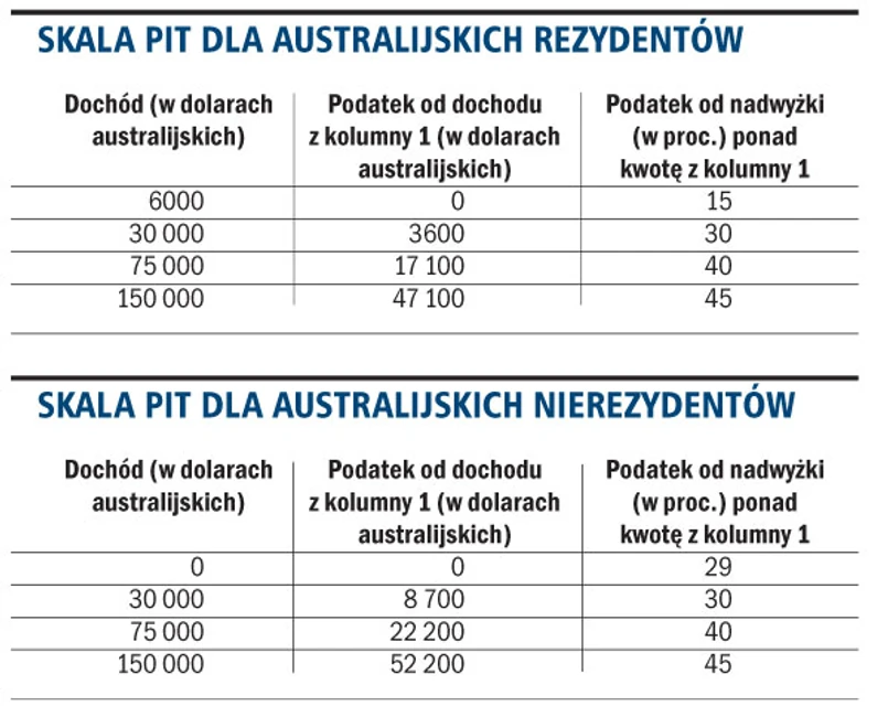 W Australii obowiązują dwie progresywne skale PIT: dla rezydentów i dla nierezydentów. Stawki podatkowe wahają się od 15 do 45 proc.