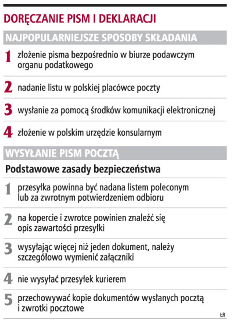 Przesłanie deklaracji czy odwołania listem poleconym nie zawsze jest bezpieczne dla podatnika. Jeżeli pismo zginie w urzędzie skarbowym, to podatnik musi udowodnić, że koperta nie była pusta. Najpewniejszą metodą doręczania pism jest ich bezpośrednie złożenie w biurze podawczym urzędu.