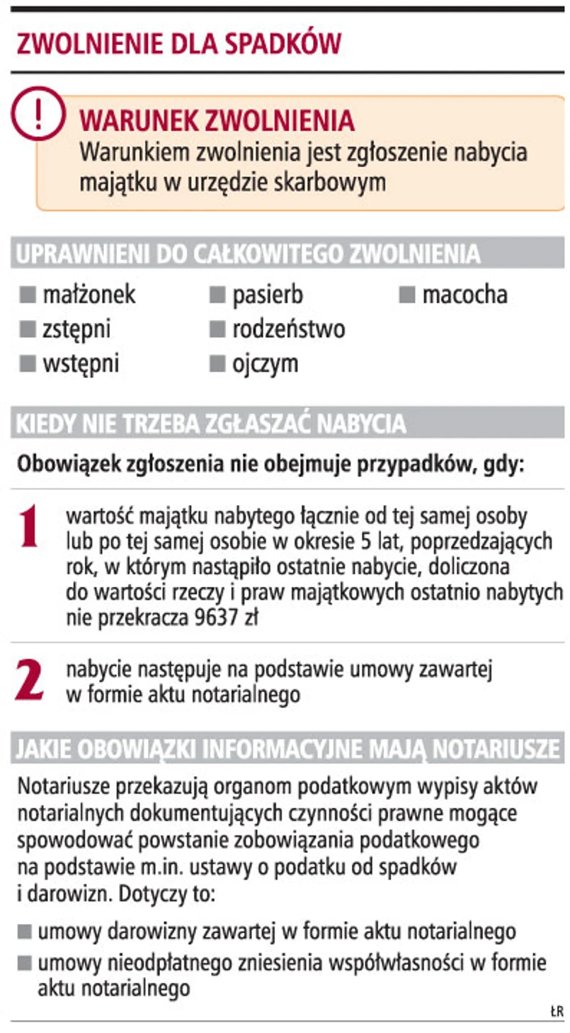 Halina Kwiatkowska, radca prawny, partner w Kancelarii Prawnej Chałas i Wspólnicy, zwraca uwagę, że zwolnienie z podatku od spadków w przypadku nabycia rzeczy i praw w kręgu najbliższej rodziny uwarunkowane jest uzyskaniem potwierdzenia nabycia spadku oraz zgłoszeniem nabycia w urzędzie skarbowym, w którego okręgu mieszkał spadkodawca. Wynika to z art. 4a ustawy z 28 lipca 1983 r. o podatku od spadków i darowizn (t.j. Dz.U. z 2004 r. nr 142, poz. 1514 z późn. zm.). W świetle znowelizowanych przepisów prawa o notariacie potwierdzenie nabycia spadku może mieć formę orzeczenia sądu lub notarialnego aktu poświadczenia dziedziczenia.
