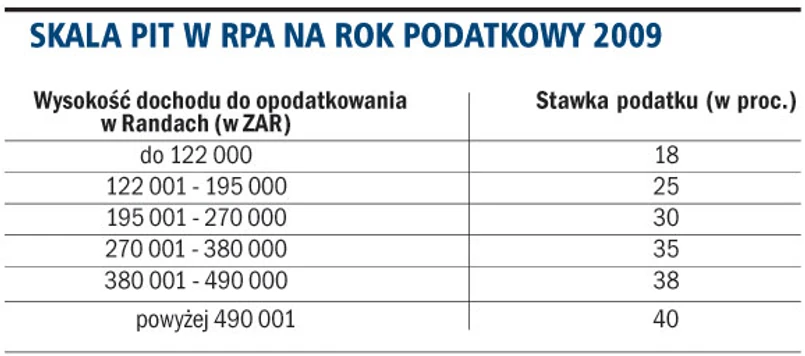 - Dochody pracownicze są opodatkowane w RPA według progresywnej skali podatkowej oscylującej pomiędzy 18 i 40 proc. Całkowita wysokość podatku dochodowego od osób fizycznych (SITE oraz PAYE) potrąconego w trakcie roku podatkowego powinna mniej więcej być równa finalnemu zobowiązaniu podatkowemu za dany rok podatkowy - tłumaczy Iwona Budek.