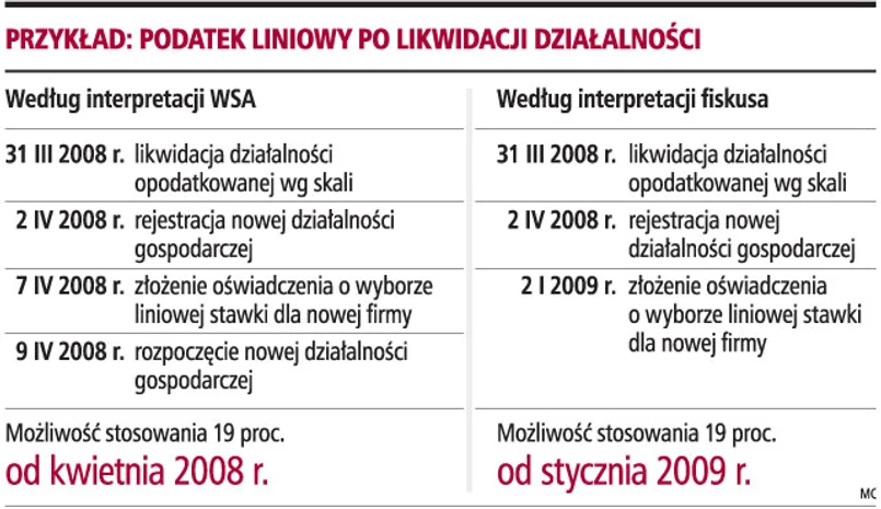 Podatnik przez kilka lat prowadził działalność gospodarczą opodatkowaną na zasadach ogólnych. Po likwidacji w kwietniu 2007 r. tej działalności założył nową firmę i złożył oświadczenie o wyborze liniowej stawki. Fiskus się z nim nie zgodził, ale rację podatnikowi przyznał WSA (wyrok WSA w Rzeszowie z 18 marca 2008 r., sygn. akt I SA/Rz 975/07, niepublikowany). Jak przypomniał sąd, co do zasady podatnik ma obowiązek złożenia do 20 stycznia roku podatkowego pisemnego oświadczenia o wyborze tego sposobu opodatkowania. W przypadku podatników rozpoczynających prowadzenie działalności gospodarczej w ciągu roku podatkowego oświadczenie składa się do dnia poprzedzającego dzień rozpoczęcia tej działalności, nie później jednak niż do dnia uzyskania pierwszego przychodu.