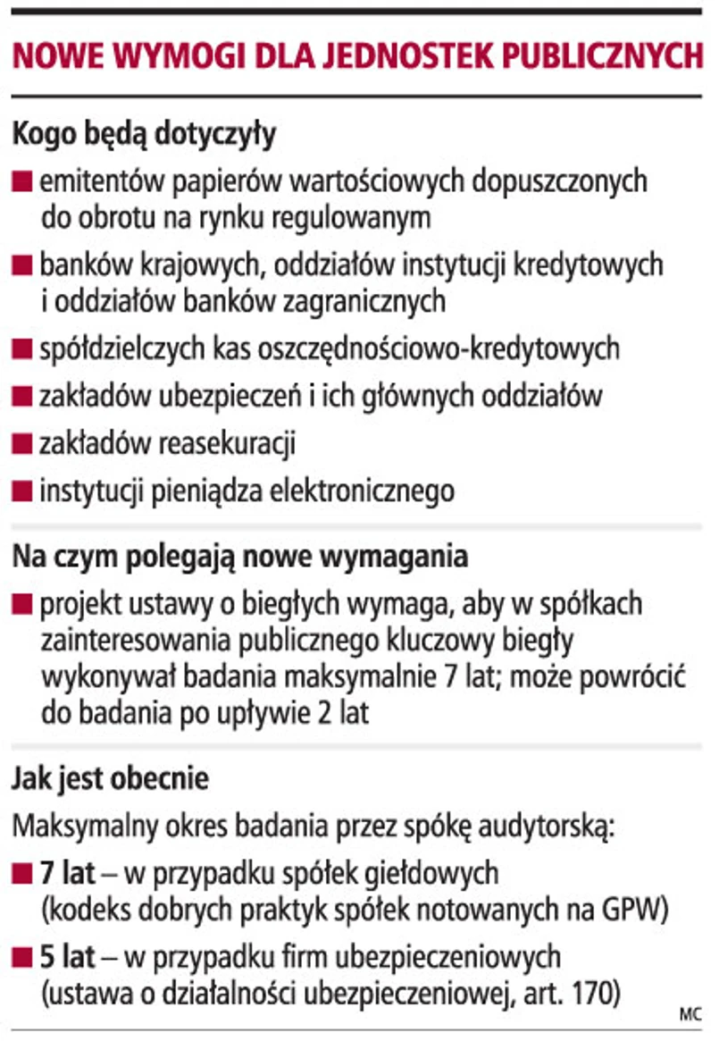 Kluczowy biegły rewident nie będzie mógł wykonywać badania w jednostce zainteresowania publicznego (np. banku, spółce giełdowej, zakładzie ubezpieczeń) dłużej niż siedem lat. Do badania takiego podmiotu będzie mógł powrócić dopiero po dwuletniej przerwie. Wprowadzenie takiego wymogu przewiduje projekt ustawy o biegłych rewidentach, który stanowi próbę implementacji 43 Dyrektywy do polskiego prawa.