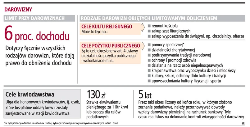 Wyjaśnijmy, że ulga obejmuje darowizny przekazane na cele: pożytku publicznego, kultu religijnego oraz krwiodawstwa. Zgodnie z ogólną zasadą darczyńca może dokonać w rocznym zeznaniu podatkowym odliczenia w wysokości dokonanej darowizny, nie więcej jednak niż kwoty stanowiącej 6 proc. dochodu. Jeżeli zatem na przykład podatnik przekazał w trakcie roku podatkowego darowiznę wyłącznie na rzecz fundacji zajmującej się działalnością charytatywną, a wartość tej darowizny mieści się w określonym przez ustawodawcę limicie, to będzie mógł odliczyć ją w całości od dochodu. W takim wypadku 6-proc. limit odnosi się wyłącznie do tej darowizny.