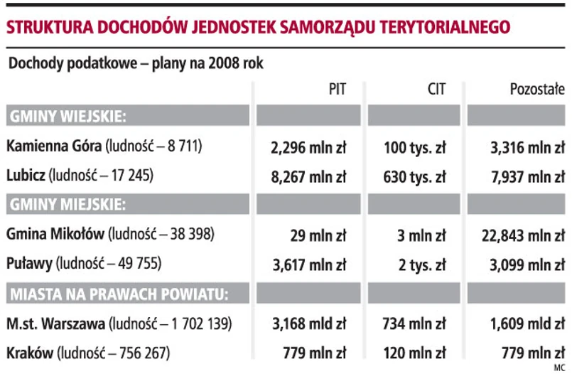 Z porównania dochodów własnych wszystkich jednostek samorządowych wynika, że najwięcej pieniędzy trafia do samorządów z podatku dochodowego od osób fizycznych, podatku od nieruchomości oraz podatku dochodowego od osób prawnych. Pełniejszy obraz dochodów gmin otrzymujemy, jeśli porównamy dochody poszczególnych jednostek. Z takiego zestawienia wynika, że największe dochody otrzymują miasta na prawach powiatu oraz gminy, w których zameldowanych jest wielu podatników o stosunkowo wysokich dochodach lub na terenie których działa wiele firm lub fabryk. Nie zawsze jednak duża liczba mieszkańców przekłada się na wysokie dochody gminy. Porównanie gmin Mikołów oraz Puławy pokazuje, jak duże mogą być dysproporcje między dochodami poszczególnych jednostek przy podobnej liczbie ludności. Dochody z tytułu udziału w PIT Mikołowa są niemal dziesięć razy wyższe niż w Puławach, przy czym w Mikołowie mieszka ponad 10 tys. osób mniej. Dla mieszkańców Puław oznacza to tyle, że gmina, w której mieszkają, ma dziesięć razy mniej pieniędzy na realizowane zadania niż gmina Mikołów.