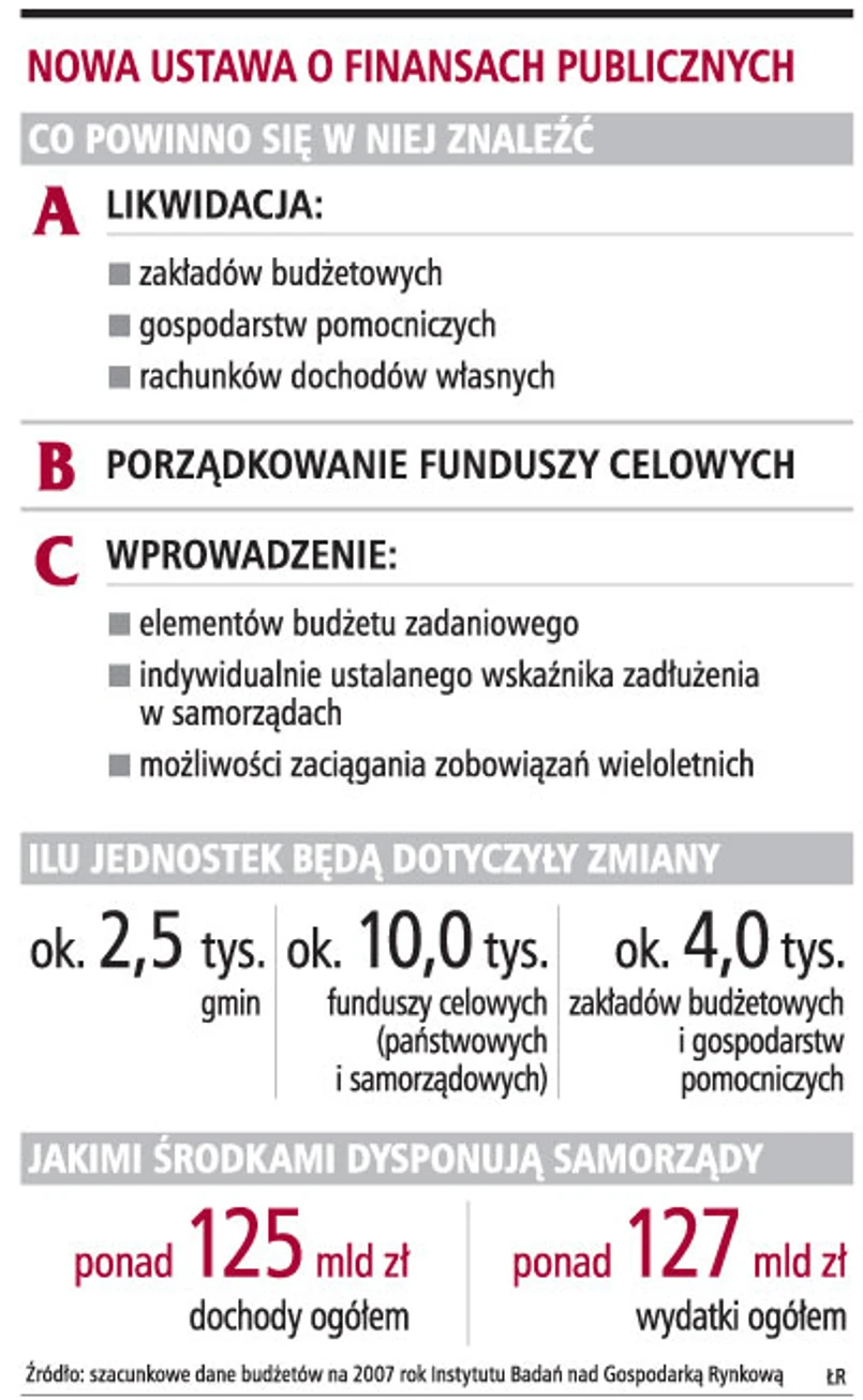 Przy okazji porządkowania sektora najczęściej wymienia się postulat likwidacji zakładów budżetowych, gospodarstw pomocniczych, funduszy celowych oraz przekształceń jednostek okołobudżetowych. Wszystkie wymienione jednostki dysponują bowiem miliardami złotych środków, nad którymi nie ma kontroli minister finansów. Z danych za 2006 rok wynika, że w sektorze ciągle funkcjonuje ponad trzy tysiące zakładów budżetowych, w tym większość samorządowych, oraz prawie tysiąc gospodarstw pomocniczych jednostek, z czego ponad 600 w podsektorze samorządowym. W 2006 roku wymienione jednostki dysponowały łącznie kwotą ponad 11 mld zł.