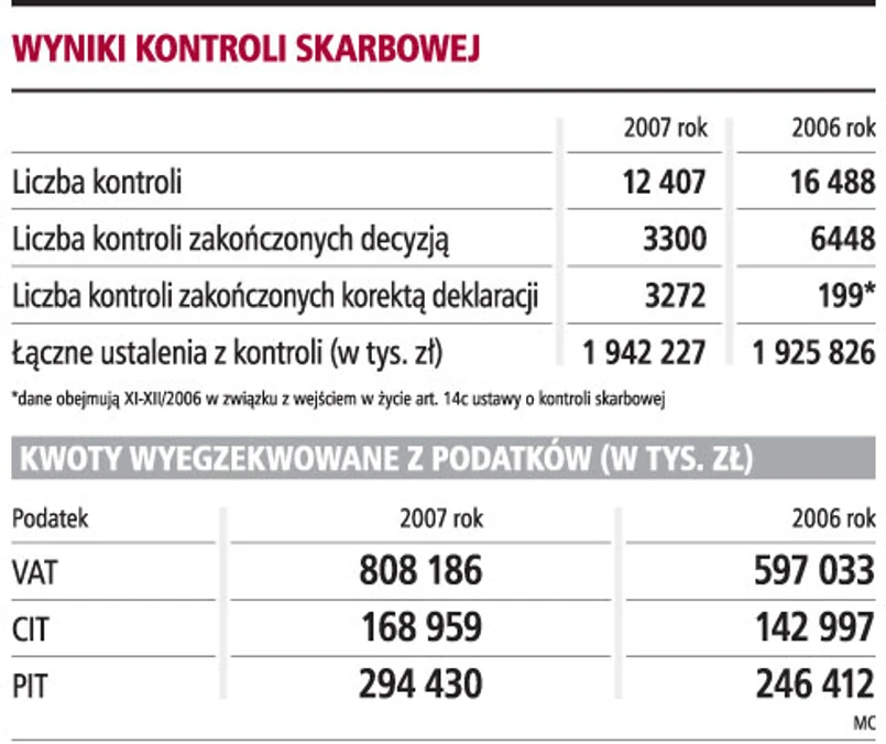 Ministerstwo Finansów opublikowało sprawozdanie z kontroli skarbowej w 2007 roku. Wynika z niego, że skuteczniejsze i bardziej trafne typowanie podmiotów do kontroli oraz lepsze określanie obszarów ryzyka, tj. zagrożonych wystąpieniem nieprawidłowości, pozwoliło na osiągnięcie w 2007 roku takich samych ustaleń jak w roku 2006, pomimo zmniejszenia o 25 proc. liczby kontroli. Z danych zebranych przez MF wynika, że w 2007 roku organy skarbowe przeprowadziły 12 407 kontroli, a w 2006 - 16 488. Natomiast kwoty wyegzekwowane w wyniku tych działań wyniosły w 2007 roku 1 942 227 tys. zł, a w 2006 roku było to 1 925 826 tys. zł.