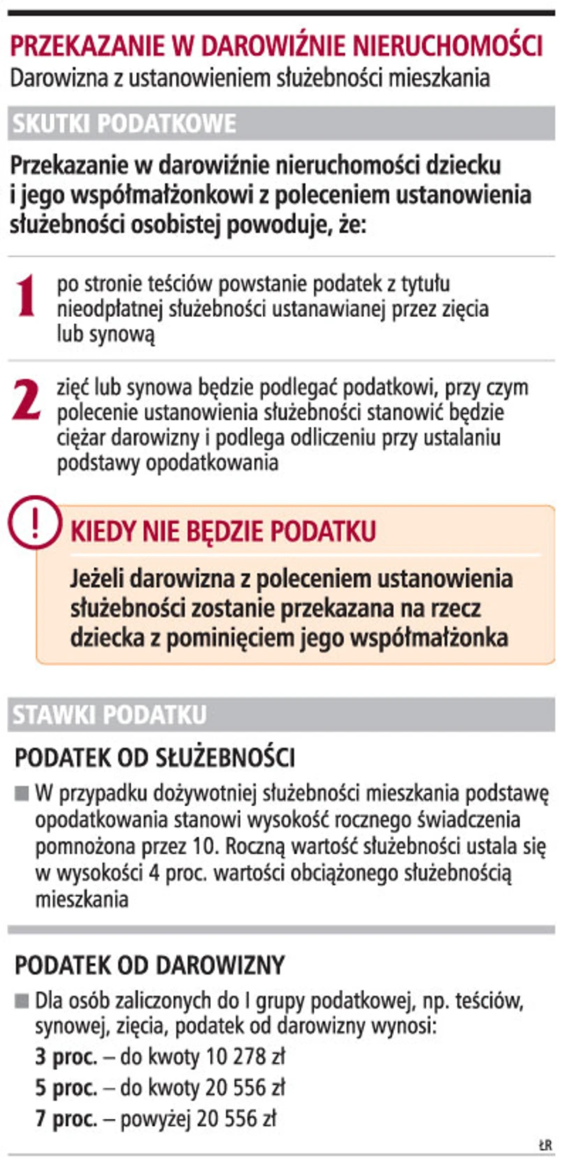 Również Halina Kwiatkowska, radca prawny w Kancelarii Prawnej Chałas i Wspólnicy wskazuje, że aby uniknąć zapłaty podatku od ustanowionej w związku z darowizną służebności, należy pamiętać, aby akt darowizny wyraźnie wskazywał, że jest ona czyniona wyłącznie na rzecz córki (syna), a służebność ustanawiana na rzecz matki (ojca), a nie teściów.