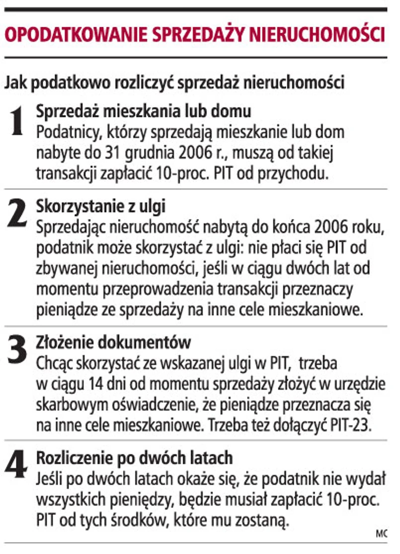 Nabycie nieruchomości przed 1 stycznia 2007 r., a zbywanych po tej dacie, jest opodatkowane 10-proc. PIT od przychodu. Rozliczenia podatku należy dokonać na PIT-23. Krzysztof Ścipień, starszy asystent podatkowy w BDO Numerica, przypomina, że podatnik może nie zapłacić tego podatku w sytuacji, gdy uzyskany przychód przeznaczy na cele mieszkaniowe w ciągu dwóch tak. Musi jednak złożyć oświadczenie w terminie 14 dni od dokonania sprzedaży. W przypadku gdy podatnik zadeklarowanej kwoty nie wyda, będzie zobowiązany następnego dnia po upływie dwóch lat złożyć PIT-23, jak i wpłacić kwotę należnego podatku.