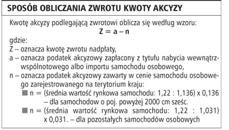 O zwrot nadpłaty w podatku akcyzowym mogą się ubiegać podatnicy, którzy kupili samochód za granicą w okresie maj 2004 - listopad 2006 r. Kwota zwrotu stanowi różnicę akcyzy obliczonej zgodnie z zasadami obowiązującymi przed 1 grudnia 2006 r. (stawki zależne od wieku samochodu) oraz akcyzy obliczanej według stawki - 13,6 proc. dla samochodów o pojemności silnika powyżej 2000 cm sześc. oraz 3,1 proc. dla pozostałych, z uwzględnieniem średniej wartości rynkowej pojazdu. Jest ona obliczana według wzoru, którego podstawą jest średnia wartość rynkowa samochodu osobowego.