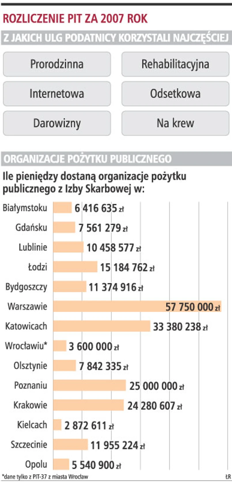 W rozliczeniu PIT za 2007 rok podatnicy najczęściej korzystali z ulgi prorodzinnej, internetowej i rehabilitacyjnej. Organizacje pożytku publicznego otrzymają rekordowe wpłaty. Dwukrotnie częściej niż w deklaracjach za 2006 rok wykazywana była nadpłata podatku dochodowego. Takie wnioski płyną z sondy Gazety Prawnej, przeprowadzonej w 14 izbach skarbowych (wszystkich jest 16 w kraju), które dokonały dla nas wstępnego podsumowania akcji PIT za 2007 rok. Dwie izby: w Rzeszowie i Zielonej Górze nie przesłały zestawienia danych ze swoich regionów.