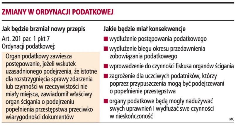 Od 1 stycznia 2009 r. organ podatkowy będzie mógł zawiesić postępowanie podatkowe, jeżeli uzna, że czynności bądź zdarzenia, które ujawnił w toku postępowania, w rzeczywistości nie miały miejsca. W takiej sytuacji fiskus będzie zawiadamiał odpowiednie organy o popełnieniu przestępstwa przeciwko wiarygodności dokumentów. Takie zmiany przewiduje projekt nowelizacji Ordynacji podatkowej, który został już skierowany do Sejmu.