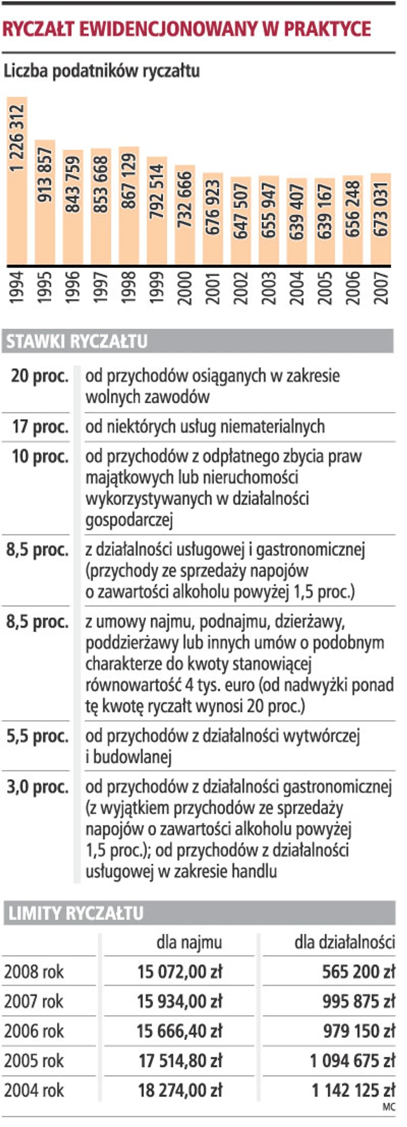 Dodaje, że stopniowe zawężanie przez ustawodawcę kręgu podmiotów mogących skorzystać z rozliczenia ryczałtem (np. w rozliczeniach za 2008 rok przekroczenie progu 150 tys. euro przychodów z działalności gospodarczej pozbawia prawa korzystania z ryczałtu już od następnego miesiąca) może wskazywać na zamiar przyszłej likwidacji ryczałtu jako formy rozliczania PIT.