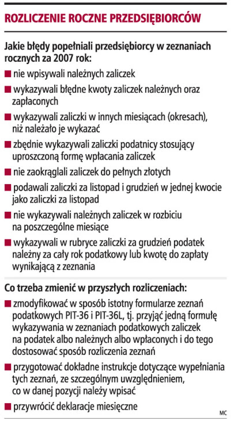 - Niestety, w dużej liczbie zeznań pojawiają się błędy. Podatnicy albo w ogóle nie wypełniają rubryk dotyczących zaliczek, uznając zapewne, że wystarczyło wykazanie łącznej (za cały rok) kwoty w rubrykach 53 (PIT-36) bądź 27 (PIT-36L), albo wykazują w nich zaliczkę wpłaconą zamiast należnej - tłumaczy Maciej Cichański.