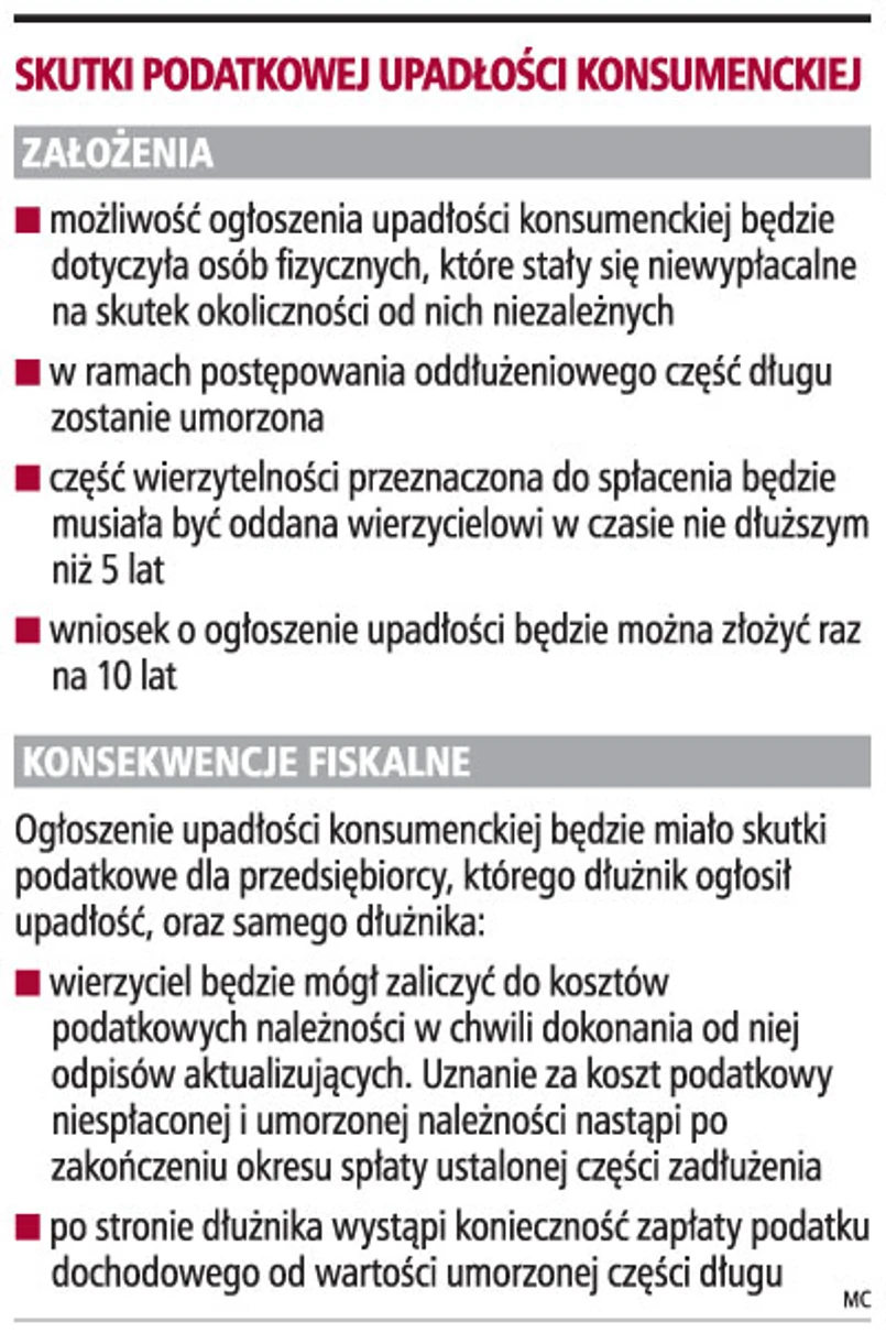 Zgodnie z projektem nowelizacji upadłość osób fizycznych niebędących przedsiębiorcami polegać ma na częściowej spłacie zobowiązania finansowego przez dłużnika. Reszta zadłużenia zostanie mu darowana. O tym, w jakiej wysokości i w jakim terminie dłużnik będzie musiał spłacić swoje zadłużenie, decydować będzie sąd. Maksymalny okres spłaty wyniesie pięć lat. Oznacza to, że wierzyciel odzyska jedynie część należności. Rodzi to określone konsekwencje podatkowe.