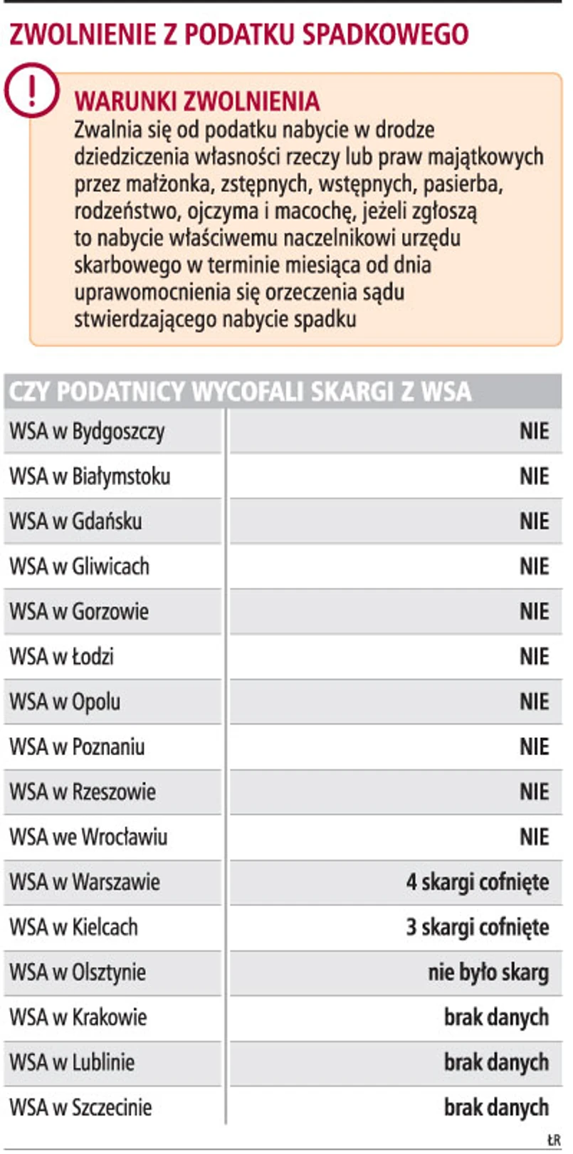 Zainteresowanie zwolnieniem z podatku spadków nabytych między 12 maja a 31 grudnia 2006 r. nie zmalało, mimo niekorzystnych wyroków Naczelnego Sądu Administracyjnego z 12 czerwca 2008 r. Z sondy GP przeprowadzonej w wojewódzkich sądach administracyjnych wynika, że podatników nie odstraszyły wyroki NSA. W WSA w Warszawie podatnicy wycofali jedynie cztery skargi, a w WSA w Kielcach tylko trzy. Pozostałe WSA nie odnotowały wycofania skarg (brak informacji z WSA w Lublinie i Szczecinie).